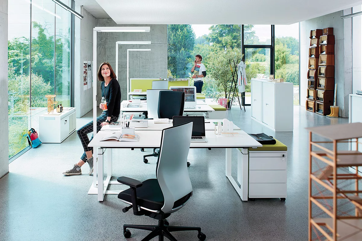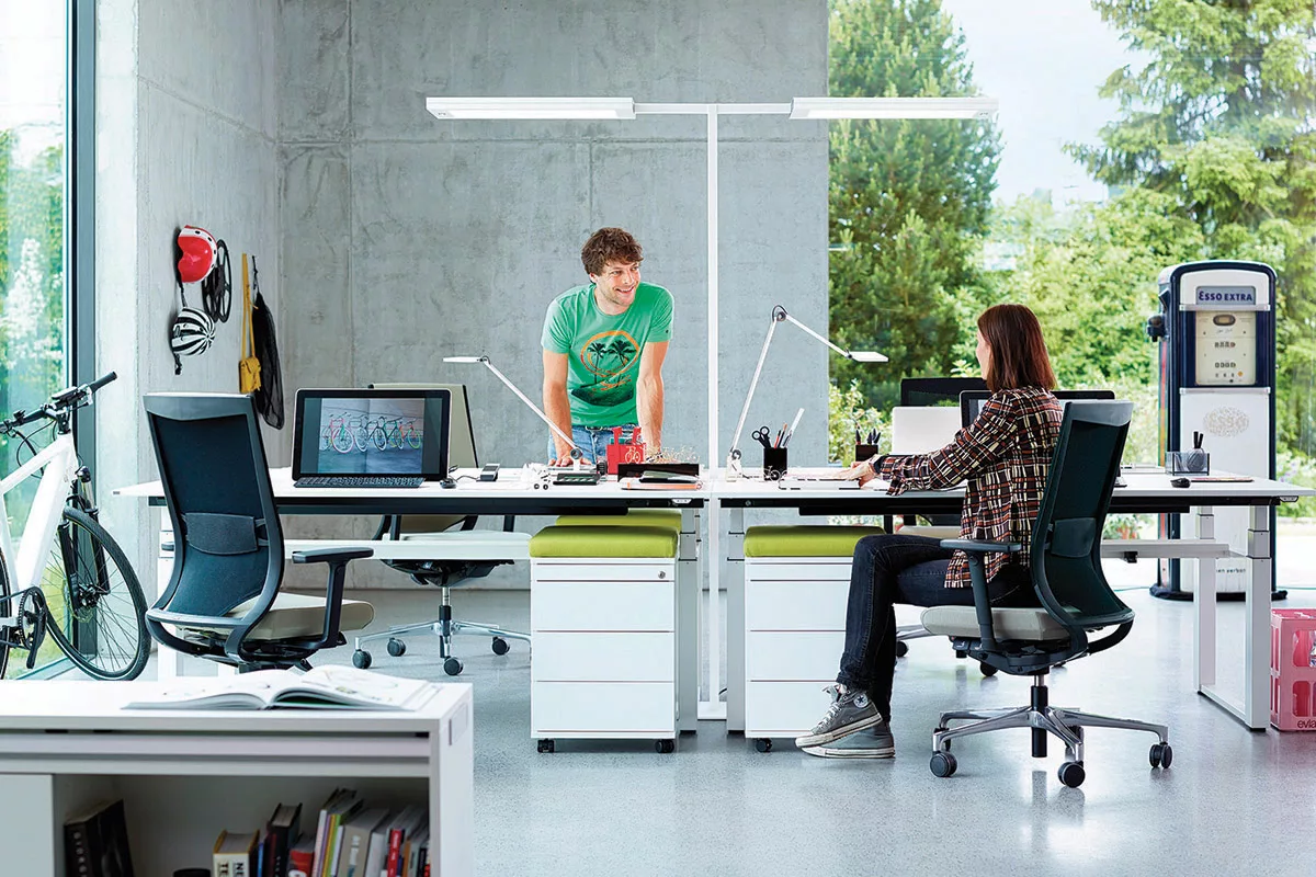 La lumière sur lieu de travail influe fortement sur le confort visuel. Le poste de travail doit bénéficier d’un éclairage suffisant, mais indirect pour éviter les reflets et éblouissements. Nos lampadaires ergonomiques disposent d’une graduation continue de l’intensité et de la température de l’éclairage, afin de limiter les risques d’éblouissement et de fatigue visuelle.