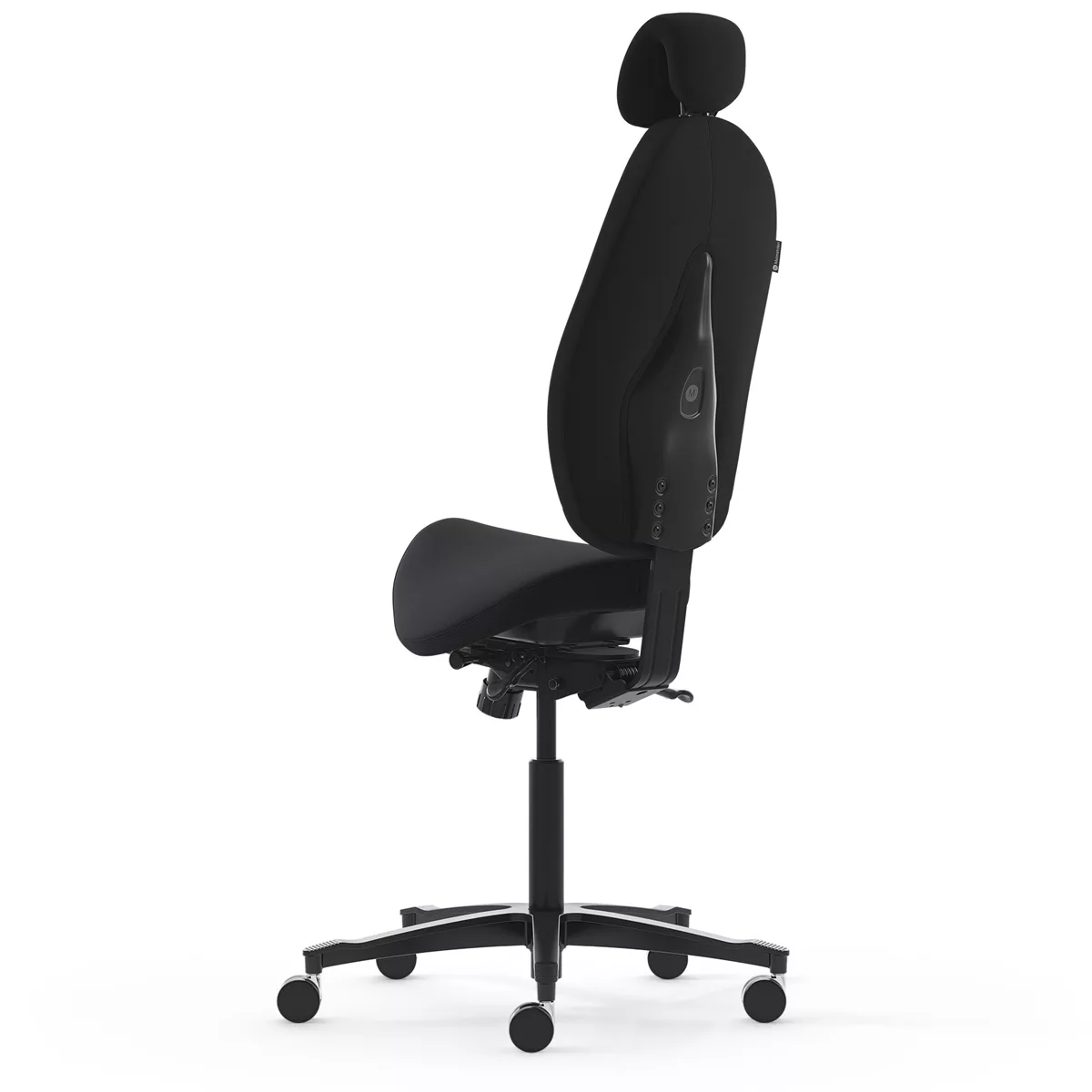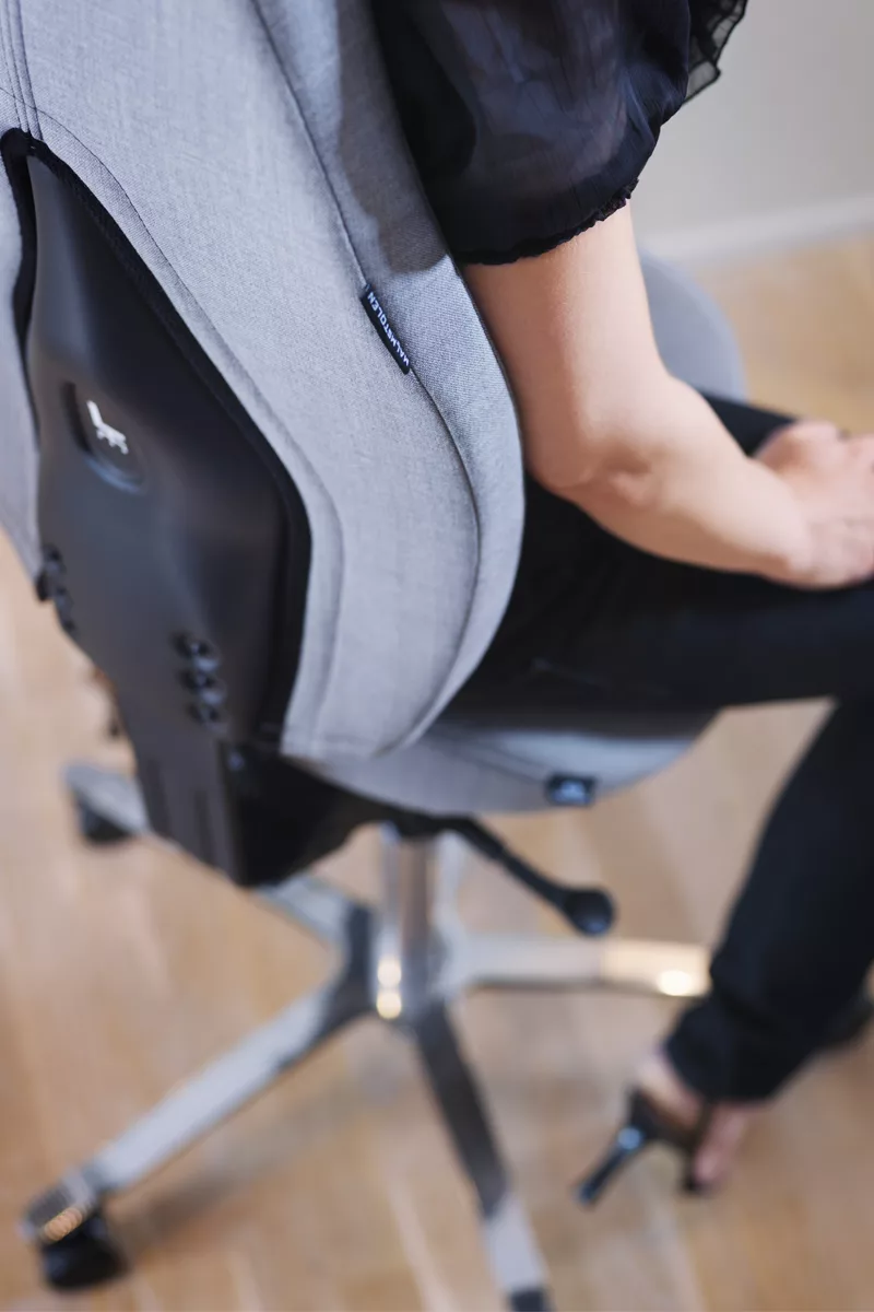 L’assise du High5, de type « selle », permet d’adopter une posture dynamique et une ouverture du bassin différente de celle proposée par une assise conventionnelle. Néanmoins, la présence d’un vrai dossier, d’un appui-tête et d’un mécanisme de bascule, soutiennent votre dos lorsque la position active se fait trop contraignante et que votre corps a besoin de repos.