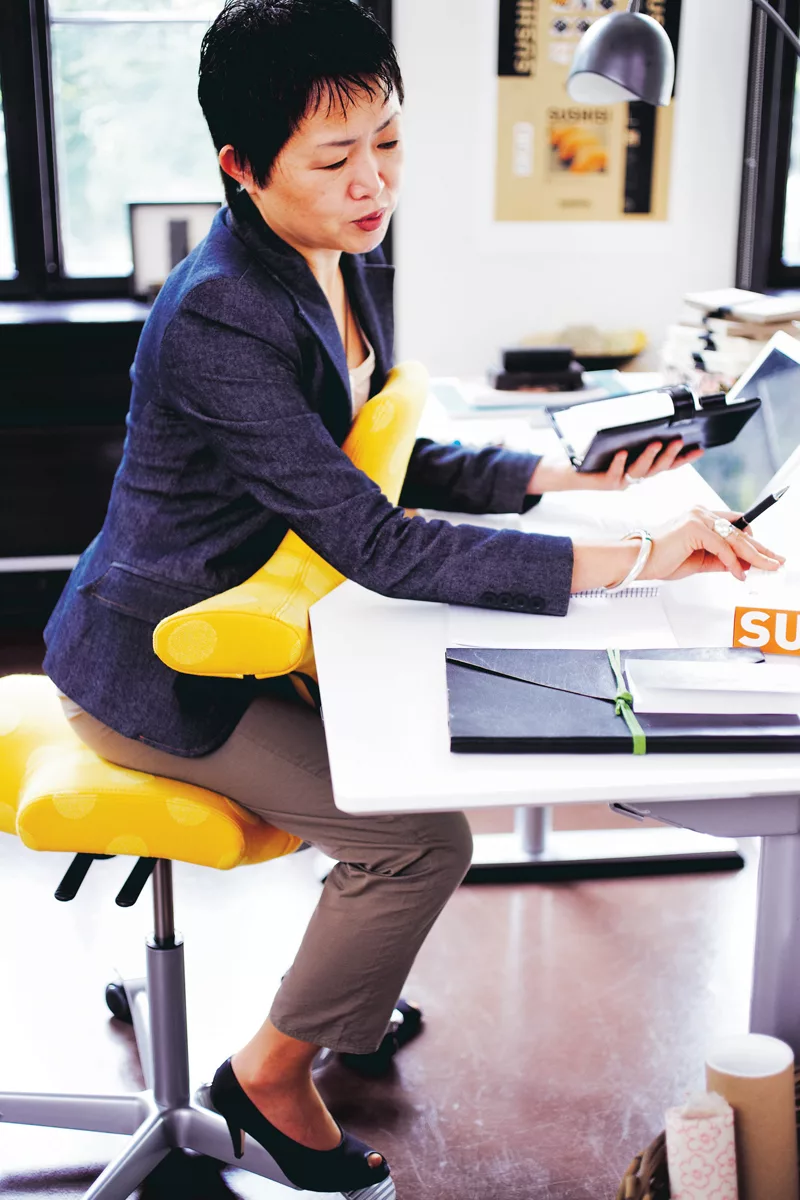 La forme unique et légendaire du siège Capisco favorise l’alternance des positions de travail. L’utilisateur peut en effet opter pour une posture assise classique, le dos en appui contre le dossier, ou bien une posture assis-debout grâce à l’assise en forme de selle réglable en hauteur, profondeur et inclinaison, ou encore une posture inversée.
